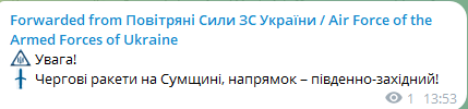 Три групи ракет летять у бік України з боку Курської області. Імовірна ціль російських загарбників — Сумська область. Військові закликають місцевих мешканців бути обережними, не ігнорувати сигналів повітряної тривоги та переміститися в укриття.