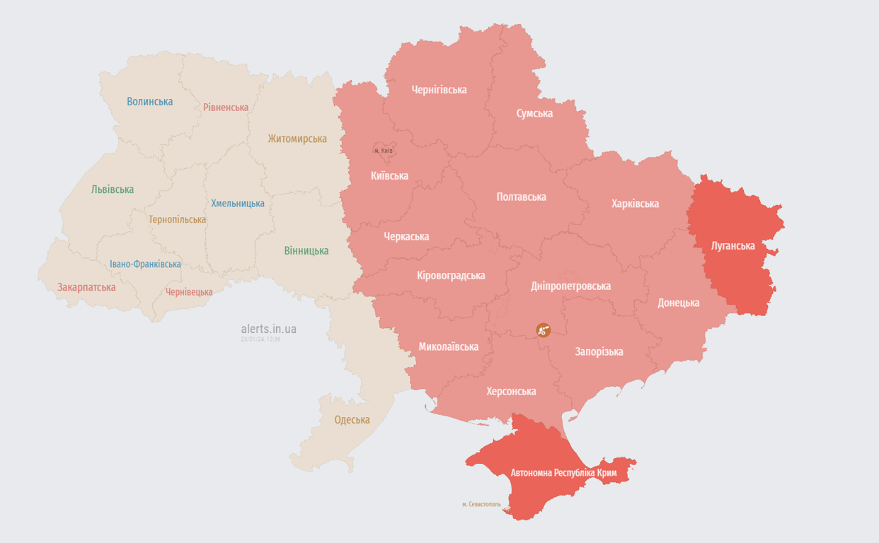 Повітряна тривога була оголошена на більшій частина території Українни.