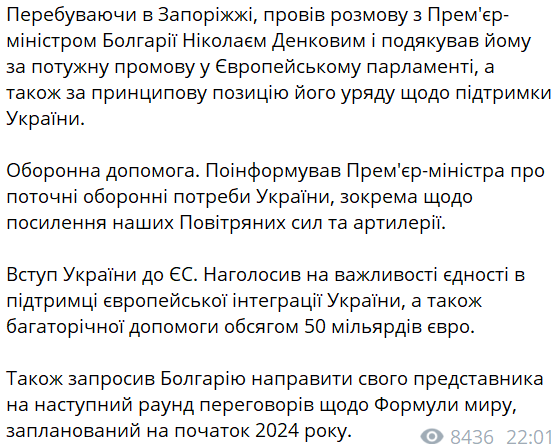 Крім того, перебуваючи в Запоріжжі, Зеленський провів розмову з Прем'єр-міністром Болгарії Ніколаєм Денковим.