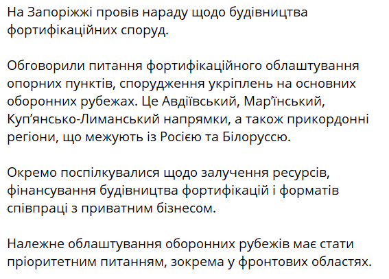 "На Запоріжжі провів нараду щодо будівництва фортифікаційних споруд. Обговорили питання фортифікаційного облаштування опорних пунктів, спорудження укріплень на основних оборонних рубежах", — йдеться у повідомленні.