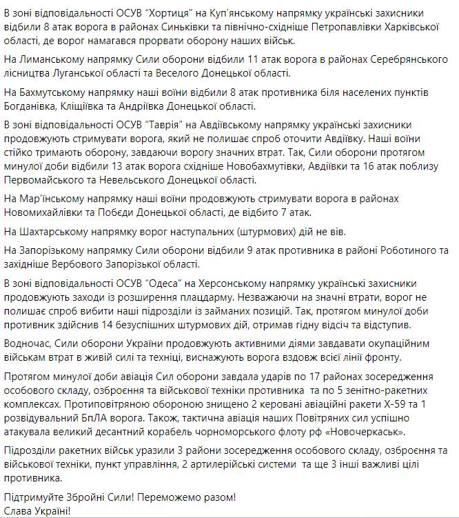 Протягом минулої доби авіація Сил оборони завдала ударів по 17 районах зосередження особового складу, озброєння та військової техніки противника та по 5 зенітно-ракетних комплексах. Протиповітряною обороною знищено 2 керовані авіаційні ракети Х-59 та 1 розвідувальний БпЛА ворога. Також тактична авіація наших Повітряних сил успішно атакувала великий десантний корабель Чорноморського флоту РФ "Новочеркаськ".