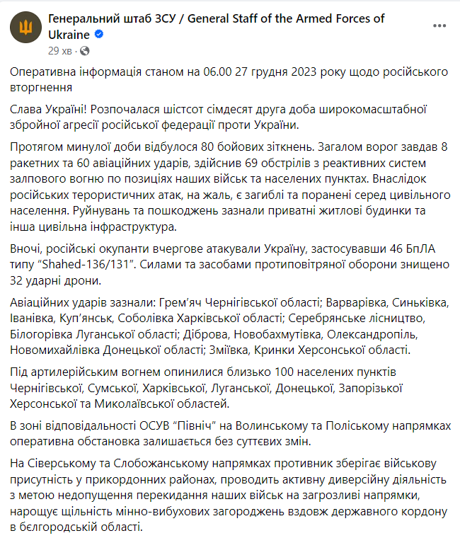 Протягом минулої доби відбулося 80 бойових зіткнень. Загалом ворог завдав 8 ракетних та 60 авіаційних ударів, здійснив 69 обстрілів з реактивних систем залпового вогню по позиціях наших військ та населених пунктах. Внаслідок російських терористичних атак є загиблі та поранені серед цивільного населення. Руйнувань та пошкоджень зазнали приватні житлові будинки та інша цивільна інфраструктура.